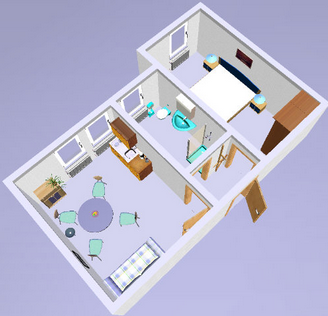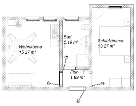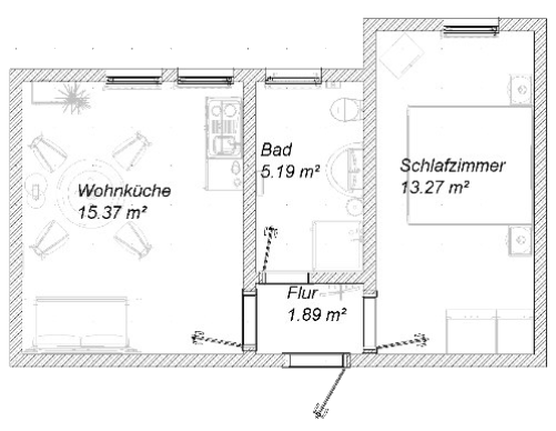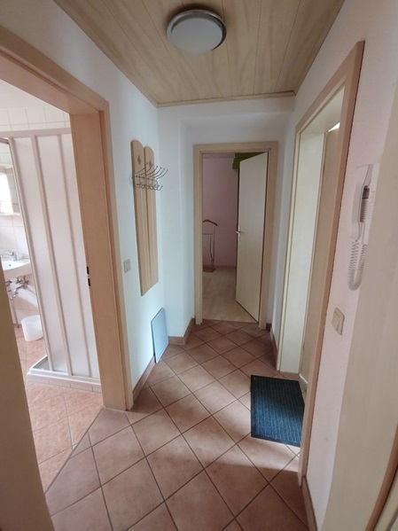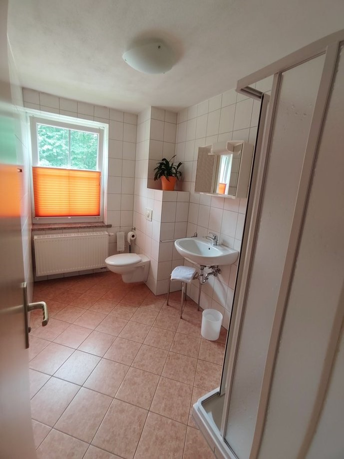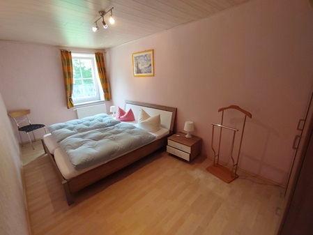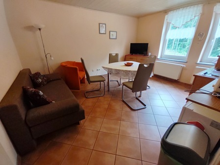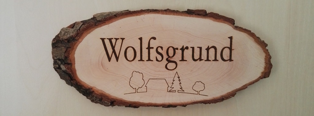 Die kleinere Ferienwohnung "Wolfsgrund" im 1. Obergeschoss ist ca. 37 qm groß und besteht aus einem kleinen Flur, einem Bad mit DU/WC, einem Schlafzimmer mit Doppelbett sowie einer großen Wohnküche. In diesem Aufenthaltsraum gibt es einen eine kleine gut ausgestattete Küchenzeile mit Spüle, 2 Elektroherdplatten, Kühlschrank, Microwelle usw. sowie einem Tisch mit Stühlen, TV, Radio und einem Schlafsofa für 2 Personen