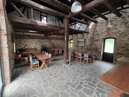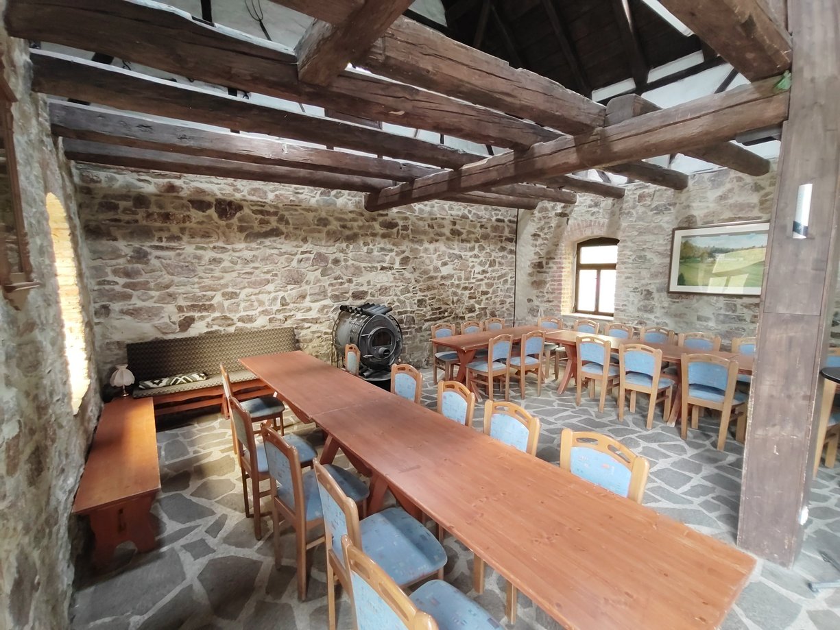 Die ehemalige Scheune haben wir zu einem gemütlichen Gruppenraum von ca. 52 qm Fläche mit urigen Natursteinwänden/-böden und Fachwerk ausgebaut. Für behagliche Wärme sorgt der große Holzofen „Bruno“, der hier auch Namensgeber des Hauses ist. Die rustikalen Tische und Bänke bieten ca. 50 Personen Platz zum Sitzen und Feiern wobei auch noch Platz zum Tanzen bleibt.