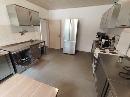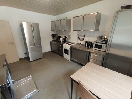 Im Erdgeschoss, direkt neben dem Kaminhaus, steht eine voll ausgestattete Selbstversorger-Küche, ca. 20 qm gross, mit Gastro-Geschirrspüler und großem Kühlschrank sowie Geschirr, Besteck, Gläser usw. für über 40 Personen zur Verfügung.